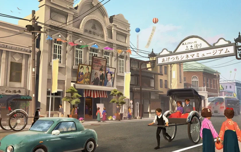 大正ロマンや昭和レトロな雰囲気が漂う日本の街並みを描いたイラスト。あげつちシネマミュージアムの看板が目を引き、人力車やクラシックカーが行き交うノスタルジックな日常が表現されている。