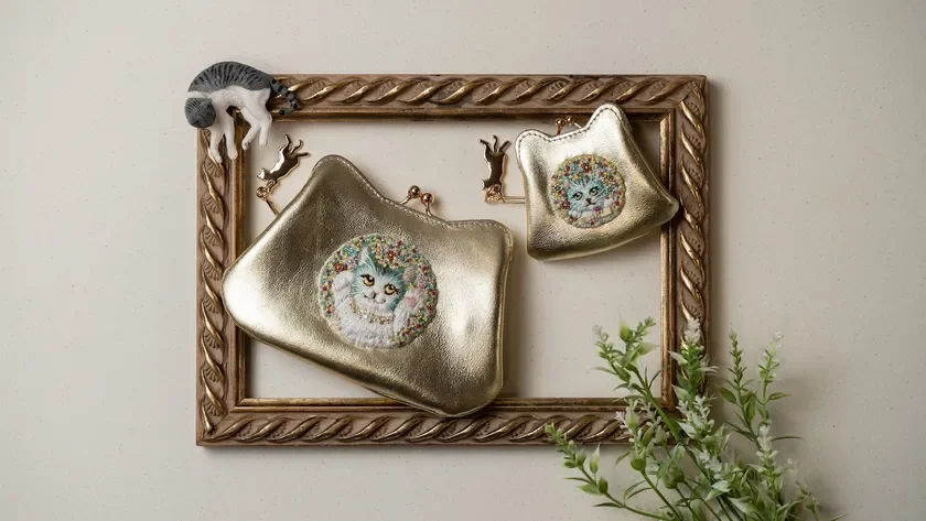 大きく開くがま口ミニウォレットは、中身の出し入れがスムーズです。内装は3室に分かれており、カード、お札、小銭をコンパクトに収納できます。マイクロがま口ポーチは、その名の通り、可愛らしいサイズ感で表現されています。どちらのアイテムにも、あお向けに寝転ぶネコのゴールドチャームが付属する特別仕様です。
