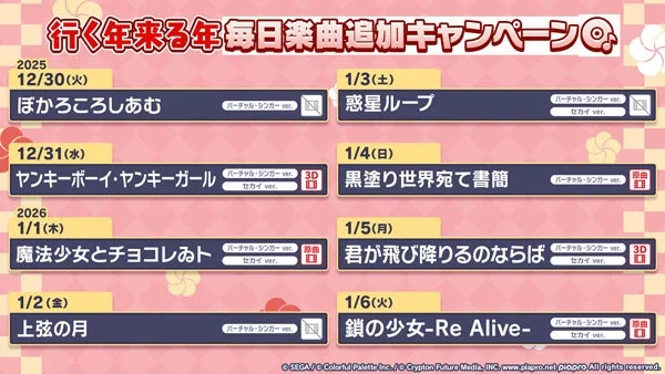 2025年12月30日(火)から2026年1月6日(火)までの8日間、毎日新しい楽曲が追加される「行く年来る年毎日楽曲追加キャンペーン」が実施されます。追加される各楽曲は、「音楽ショップ」で「ミュージックカード」と交換することで、リズムゲームとしてお楽しみいただけます。