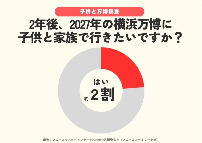 横浜万博について「子どもと家族で行きたいと思うか」という質問に対し、「はい」と答えたのは23.8%でした。一方で、「わからない」と回答した家庭が45.9%と約半数を占めており、今後の情報発信が来場意欲を左右する重要な鍵となるでしょう。