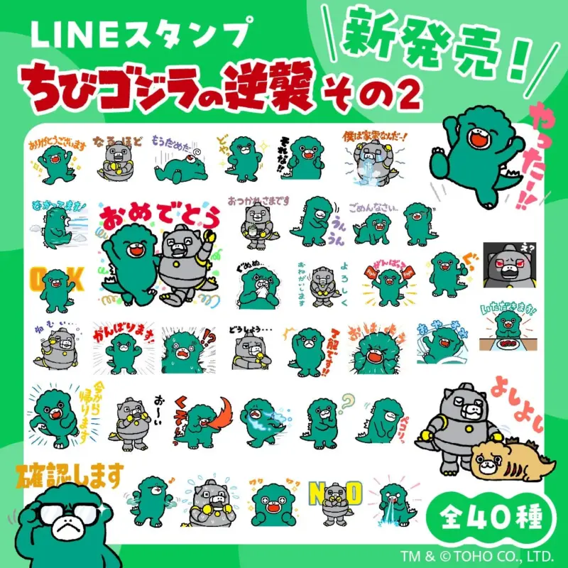 LINEスタンプ「ちびゴジラの逆襲 その2」では、主人公のちびゴジラと、怪獣島で一番のしっかり者であるちびメカゴジラが大活躍します。怪獣島での二匹の日常会話を切り取ったかのような、使いやすい全40種類のスタンプは、全てLINEスタンプのために描き下ろされたものです。お仕事からプライベートまで、様々なシーンで活用できる幅広いラインナップが用意されており、アニメ視聴者だけでなく、ゴジラファンの皆様にもきっと楽しんでいただけるでしょう。