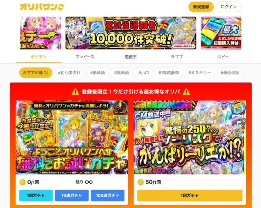 オリパワンは、オンラインでトレーディングカードの開封体験を楽しめるオンラインオリパサービスです。高還元率ガチャやアド確定イベント、独自演出、コラボ企画などを通じて、自宅にいながら「開封のドキドキ」を味わえる体験を提供しています。