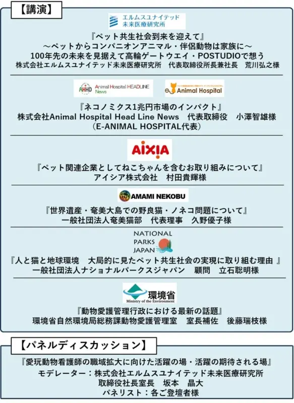 • 荒川弘之(株式会社エルムスユナイテッド未来医療研究所 代表取締役所長兼社長): 先進医療研究と臨床病院運営を両軸に、人医療と獣医療の研究に取り組み、「ねこ腎臓病の治療へのAIM活用」の共同研究を進めています。2026年冬には高輪ゲートウェイシティに先進医療アニマルクリニックを開設予定です。