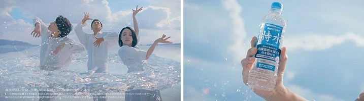 澄み渡る青空と湖面が織りなす幻想的な風景の中、3人の出演者がそれぞれの個性を生かしたウォーターダンスを披露します。広大な自然に溶け込むような動きとともに、水が生命を宿したかのように彼らの周囲を自由に巡り、時に寄り添い、時に躍動的に絡み合います。フラフープのようにお腹のまわりを巡る水の軌跡が、特別な水「特水」を象徴する印象的なCMです。