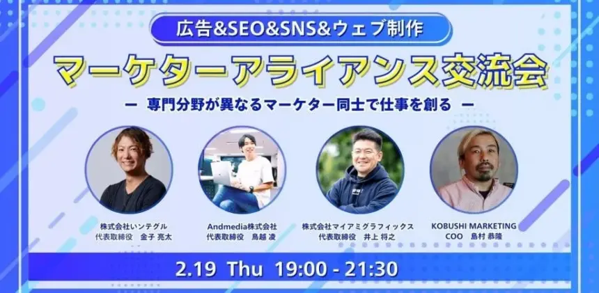 KOBUSHI MARKETING合同会社は、2026年2月19日(木)に渋谷道玄坂の「KOBUSHI BEER LOUNGE & BAR」にて、「マーケターアライアンス交流会」を開催すると発表しました。本イベントは、広告、SEO、SNS、Web制作といった異なる専門分野を持つプロフェッショナルたちが一堂に会し、新たなビジネスパートナーシップを築くことを目的としています。