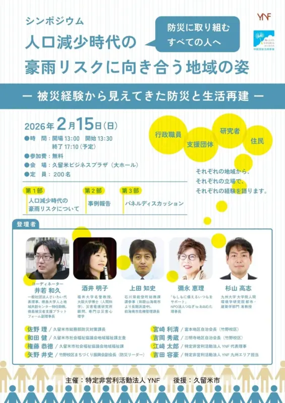 本シンポジウムには、一般社団法人さいわい代表理事の井若 和久氏、福井大学名誉教授の酒井 明子氏、石川県能登町総務課課参事の上田 知史氏、NPO法人つながる te おおむた理事長の彌永 恵理氏、九州大学大学院人間環境学研究院准教授の杉山 高志氏をはじめ、久留米市の関係者や地域の防災リーダーが登壇し、それぞれの経験と知見を共有します。