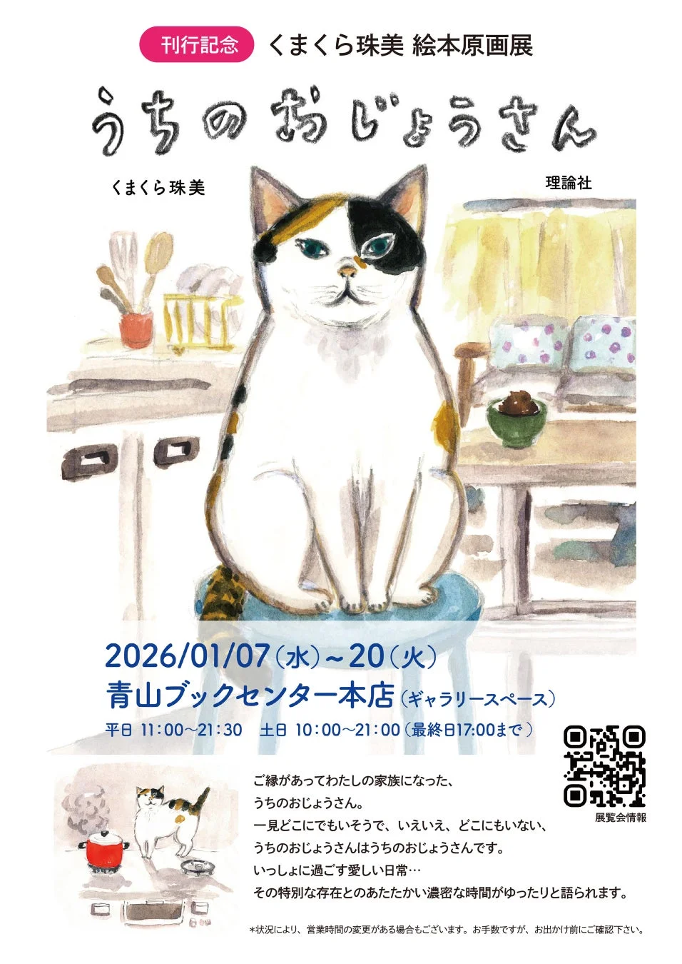 この原画展では、絵本に登場する貴重な原画全点を見ることができる特別な機会です。また、会場では数量限定でくまくら珠美さんの<猫絵作品>やオリジナルグッズ、直筆サイン本も販売されます。さらに、くまくら珠美さんの著作物を購入された方には、青山ブックセンター本店が初出しとなる『うちのおじょうさん』オリジナルポストカードがプレゼントされます。