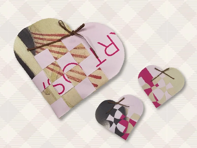 織り込まれた紙で作られた大小3つのハート型の装飾品が、チェック柄の背景に置かれています。ピンク、ベージュ、グレーなどの色合いで、リボンがアクセントになっています。