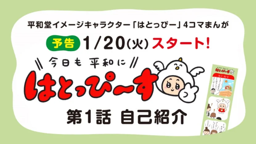 平和堂は、イメージキャラクター「はとっぴー」の認知向上を目指す「はとっぴーだいすき!プロジェクト」の第2弾として、平和堂オリジナル4コマまんが『はとっぴ~す』の配信を2026年1月20日(火)より開始します。このまんがでは、はとっぴーの何気ない平和(ピース)な日常が、ほのぼのとしたストーリーで描かれます。