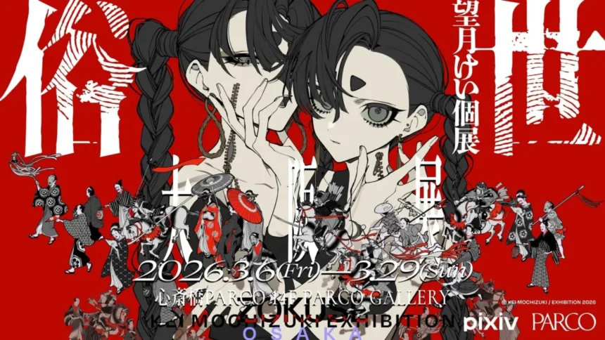 人気イラストレーター望月けい氏の個展「俗世」の大阪展が、2026年3月6日(金)から3月29日(日)まで、心斎橋PARCOにて開催されます。本展は、東京会場で1万人以上もの来場者を迎えて好評を博した展示の巡回展として、企画協力にピクシブ株式会社が参画しています。