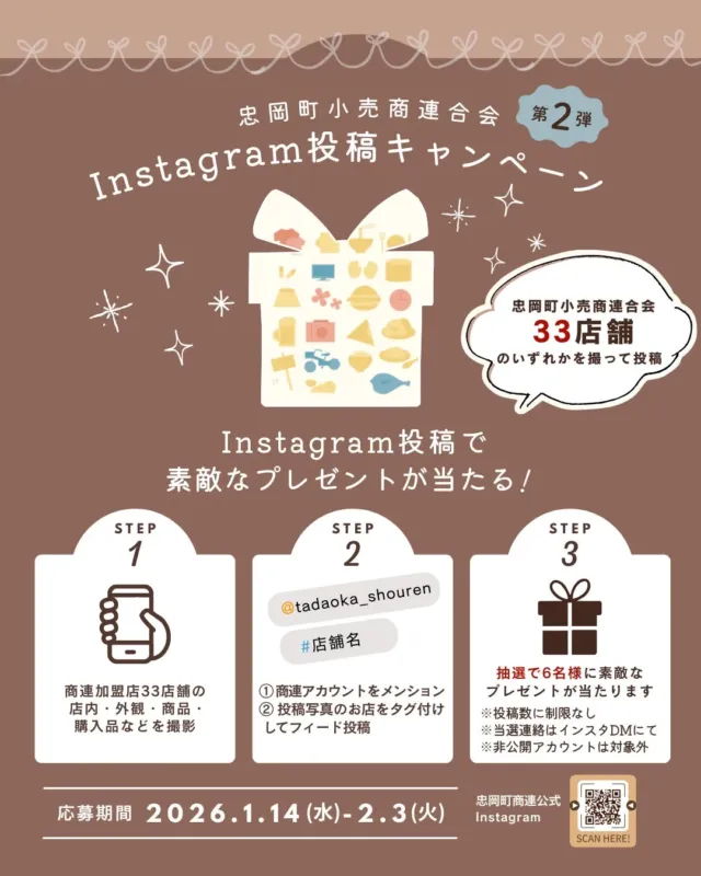 - 忠岡町小売商連合会公式アカウント(@tadaoka_shouren)をメンションし、撮影した店舗のアカウント、または店舗名をタグ付けして応募完了です。