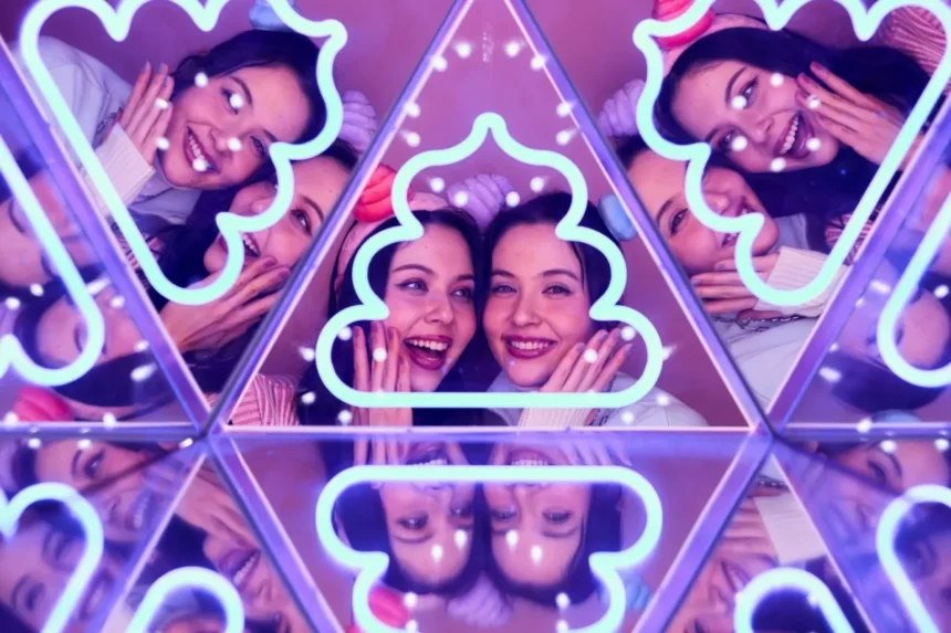 うん語ネオンの前でポーズをとる若者たち