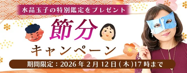 『節分キャンペーン』は、旧暦での大晦日であり、1年の運気の変わり目である「節分」に合わせて企画されました。キャンペーン期間中に対象鑑定を利用すると、水晶玉子氏による今だけの特別鑑定がプレゼントされます。東洋占星術では「節分」の翌日である立春から、新しい1年の運気の波が始まるとされています。この機会に、「水晶玉子◆エレメンタル占星術」の占いを楽しんでみてはいかがでしょうか。