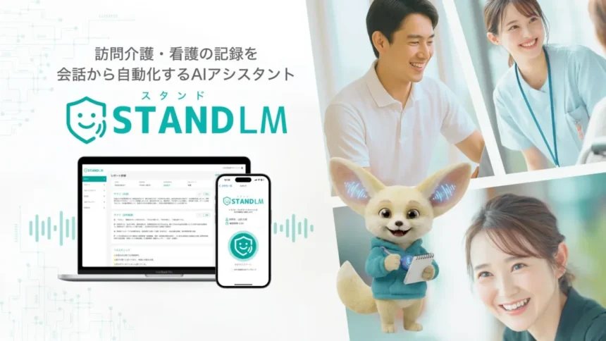 「スタンドLM」は、ケア現場での会話をAIが聞き取り、レポートを自動で生成するAIアシスタントです。利用者情報や計画書などの背景情報も考慮に入れ、ケア内容の提案や報告書の自動作成までを支援します。スマートフォンアプリから手軽に録音・解析が行え、ハラスメントやトラブルの検知にも対応しています。