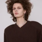 金髪の若い女性が白い壁の部屋でポーズをとっています。背後には「I'M SCARED OF BEING TOO MUCH」と書かれたアート作品などが飾られています。