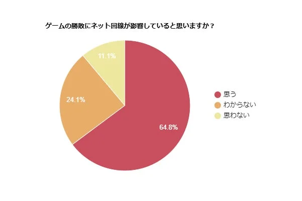 ネット回線がゲームの勝敗に影響するかというアンケートを実施したところ、64.8%が「影響する」と回答しました。特にリアルタイムでの対戦ゲームにおいては、ラグが反応速度などに直接的な影響を与えることもあるため、多くのプレイヤーがその重要性を理解していると言えます。