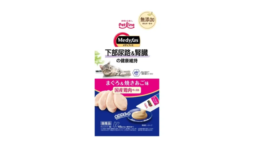 「メディファス スナック」は、ミネラルなどを調整した尿pH設計やたんぱく質、ナトリウム含有量に配慮し、主食と連動したトータルサポートを実現します。国産鶏肉と焼きあごパウダーをベースに、まぐろ・かつお・ささみの3種の味で、おいしい時間と健康ケアを同時に提供します。