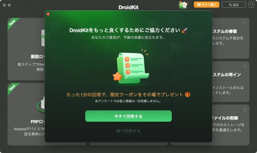 製品のさらなる改善を目指し、ユーザーからの貴重なフィードバックを迅速に収集するため、アプリ内にアンケートフォームの入口が新設されました。回答された方には、限定クーポンやAmazonギフトカードが進呈されるとのことです。