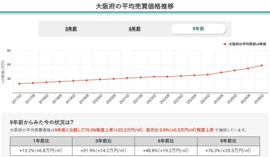 2026年2月時点の大阪府全体における中古マンションの平均売買平米単価は59万円です。これは9年前と比較して25.3万円の増加にあたり、上昇率は76.3%を記録しています。府内の中古マンション市場が長期にわたり力強い成長を続けていることが示されています。