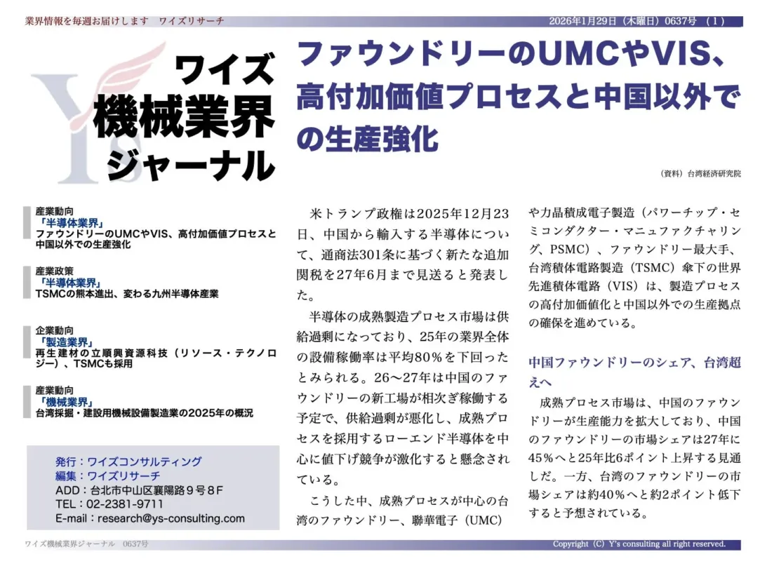 ワイズコンサルティング グループが発行する「ワイズ機械業界ジャーナル」2026年1月第4週号では、TSMCの熊…