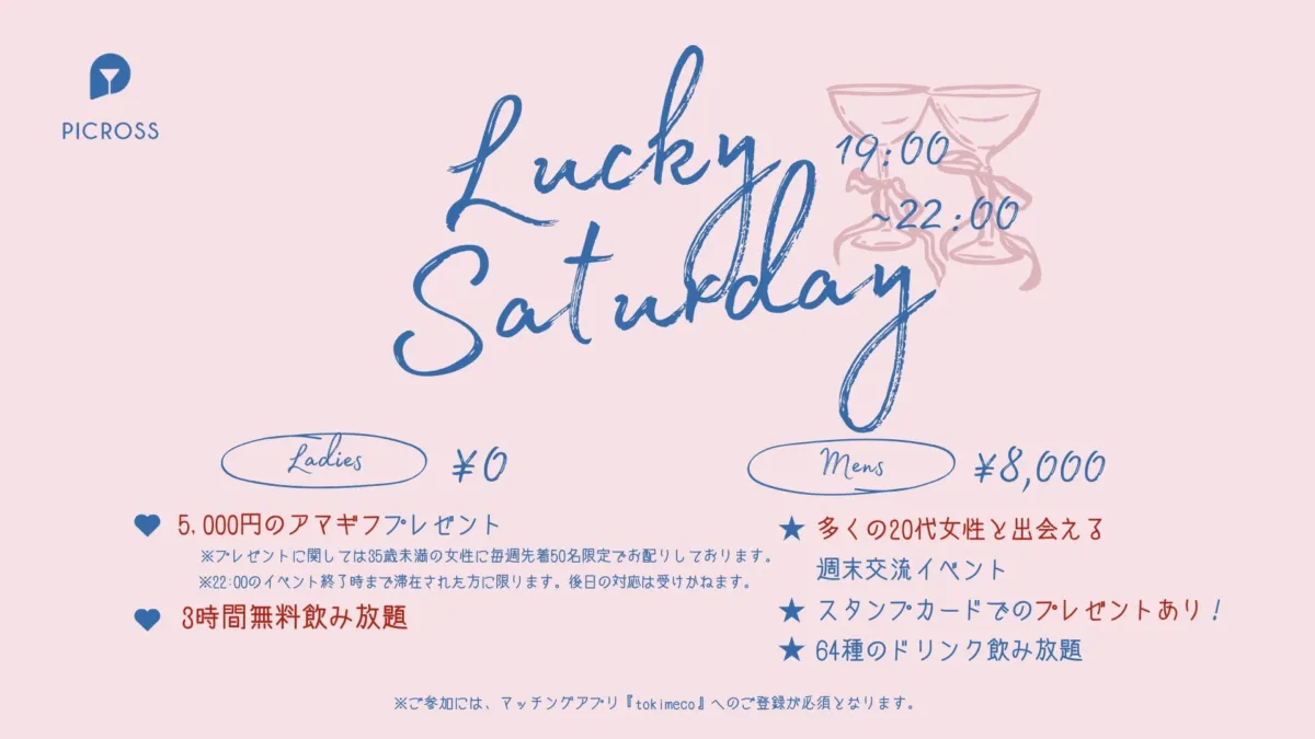 週末の出会いを豊かに!PICROSS大塚店で『Lucky Saturday』イベントがスタート―女性はアマギフ5,000円分&無料飲み放題