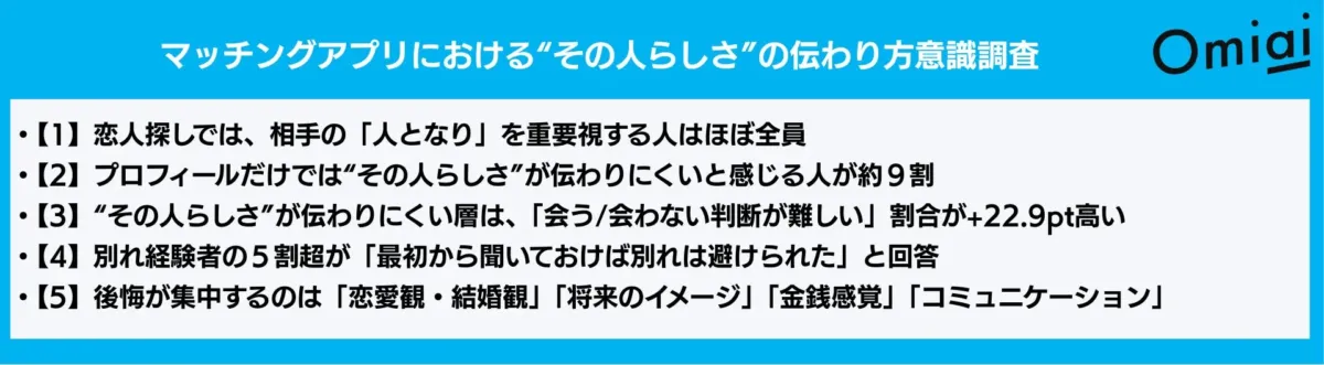 マッチングアプリ「Omiai」の意識調査により、婚活者の8割以上がプロフィールでは相手の「人となり」が伝…