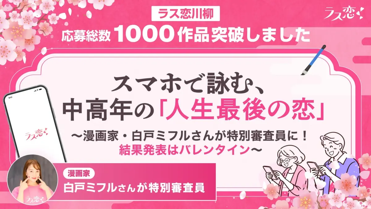 中高年の「人生最後の恋」を詠む「ラス恋川柳」応募総数1,000作品突破!漫画家・美容家の白戸ミフルさんが特別審査員に就任