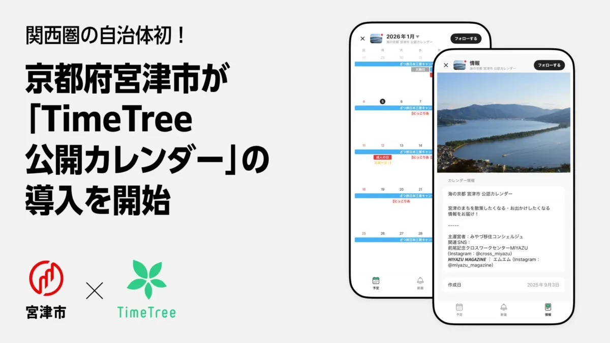京都府宮津市は、カレンダーシェアアプリ「TimeTree」の公開カレンダーを関西圏の自治体として初めて導入…