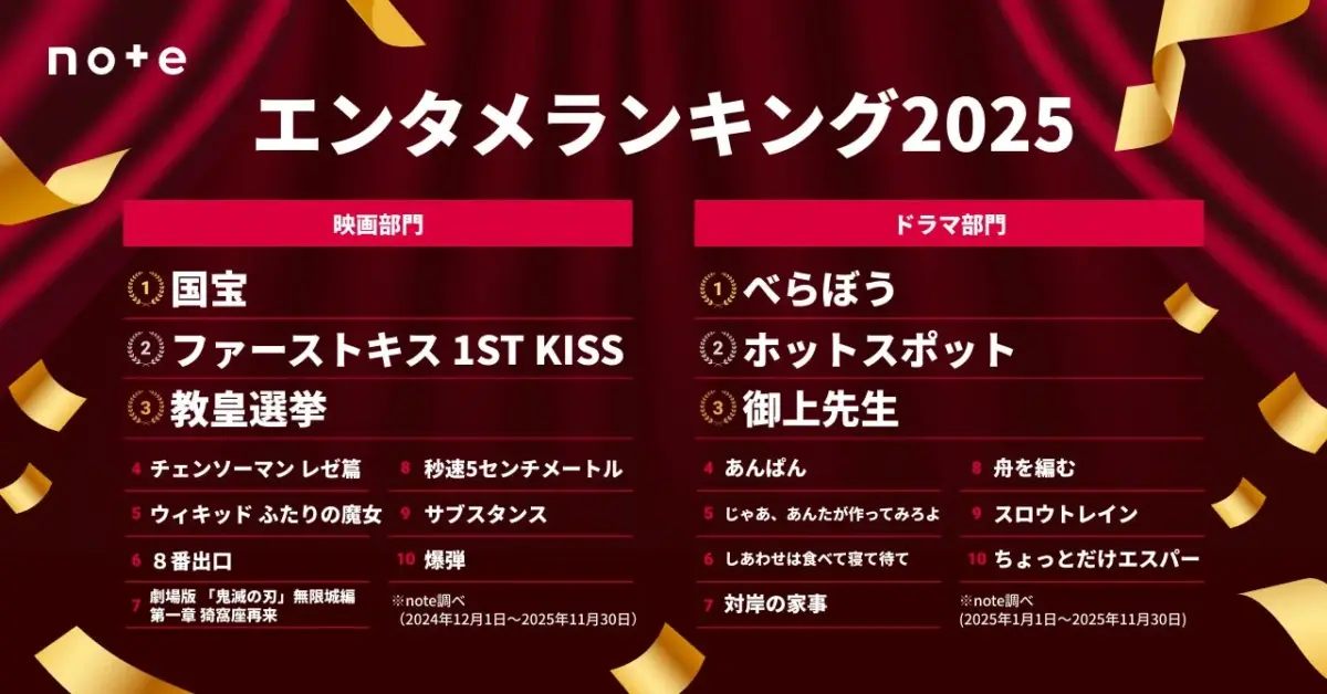 2025年エンタメ決定版!noteが発表する映画・ドラマランキングTOP20、映画は『国宝』、ドラマは『べらぼう』が首位に